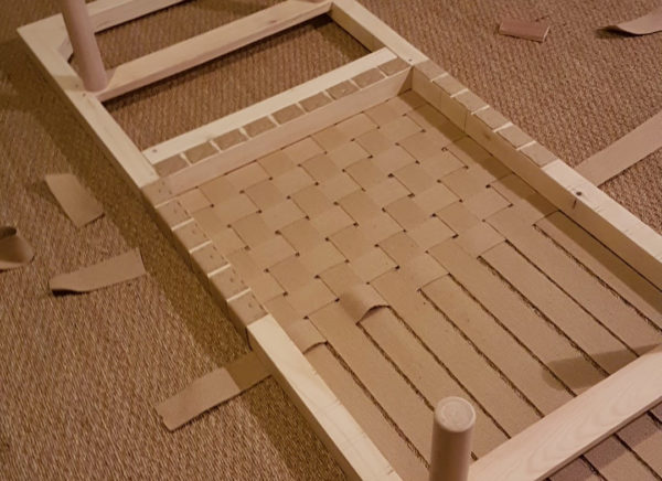 Vient ensuite l’étape du sanglage. Nous travaillons avec un petit fournisseur français pour les sangles en jute. Chaque banquette est sanglée à la main, par nos soins.