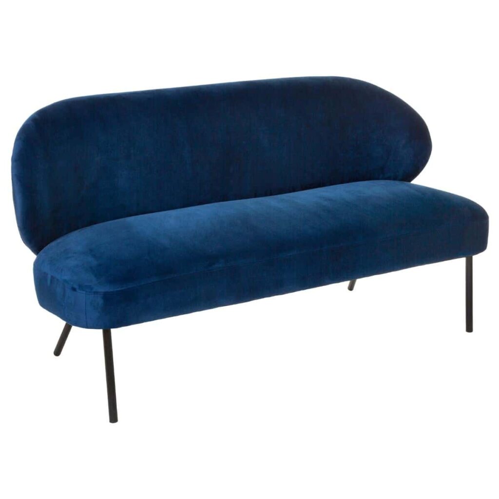 Très jolie banquette en velours bleu, 2 places. Elégante et compacte, elle sera parfaite pour vos espaces salon ou pour meubler une scène de conférence.