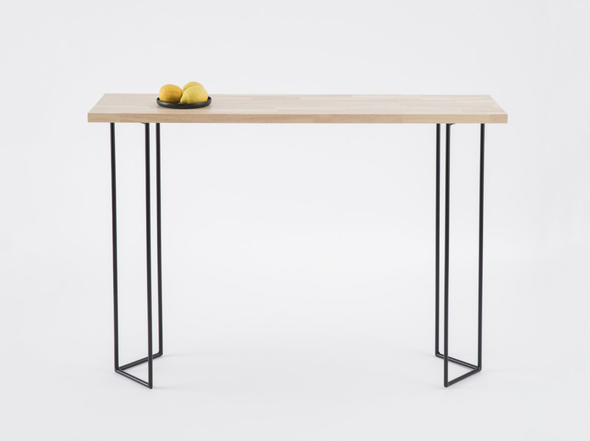 Console en bois et piétements en métal noirs. Design léger et élégant. Ses pieds sont démontables pour un stockage à plat