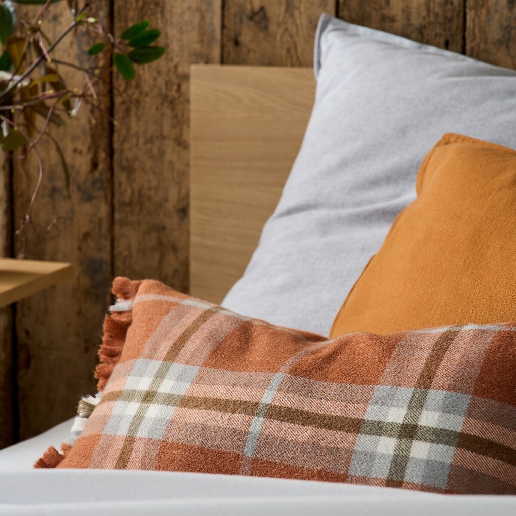 Coussin à carreaux rectangulaire. Joli tissu tartan aux couleurs chaudes