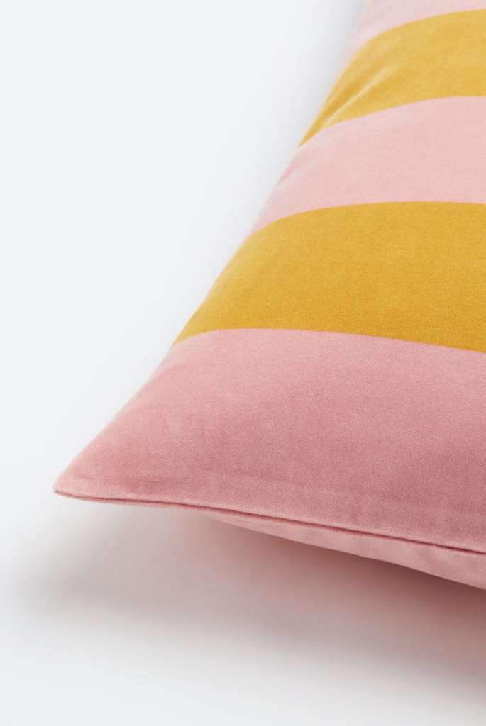 Coussin en velours rayé jaune et rose. Couleurs douces et tendances.