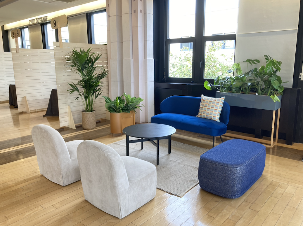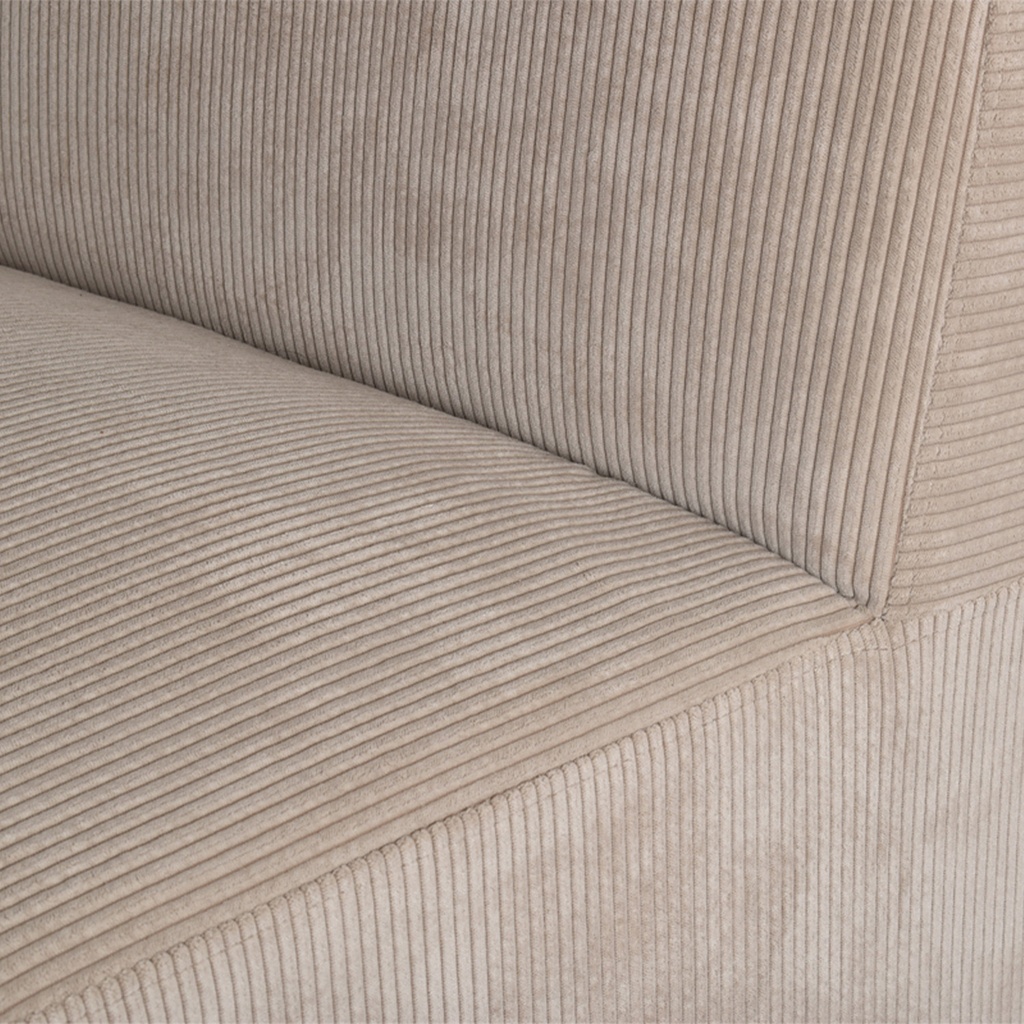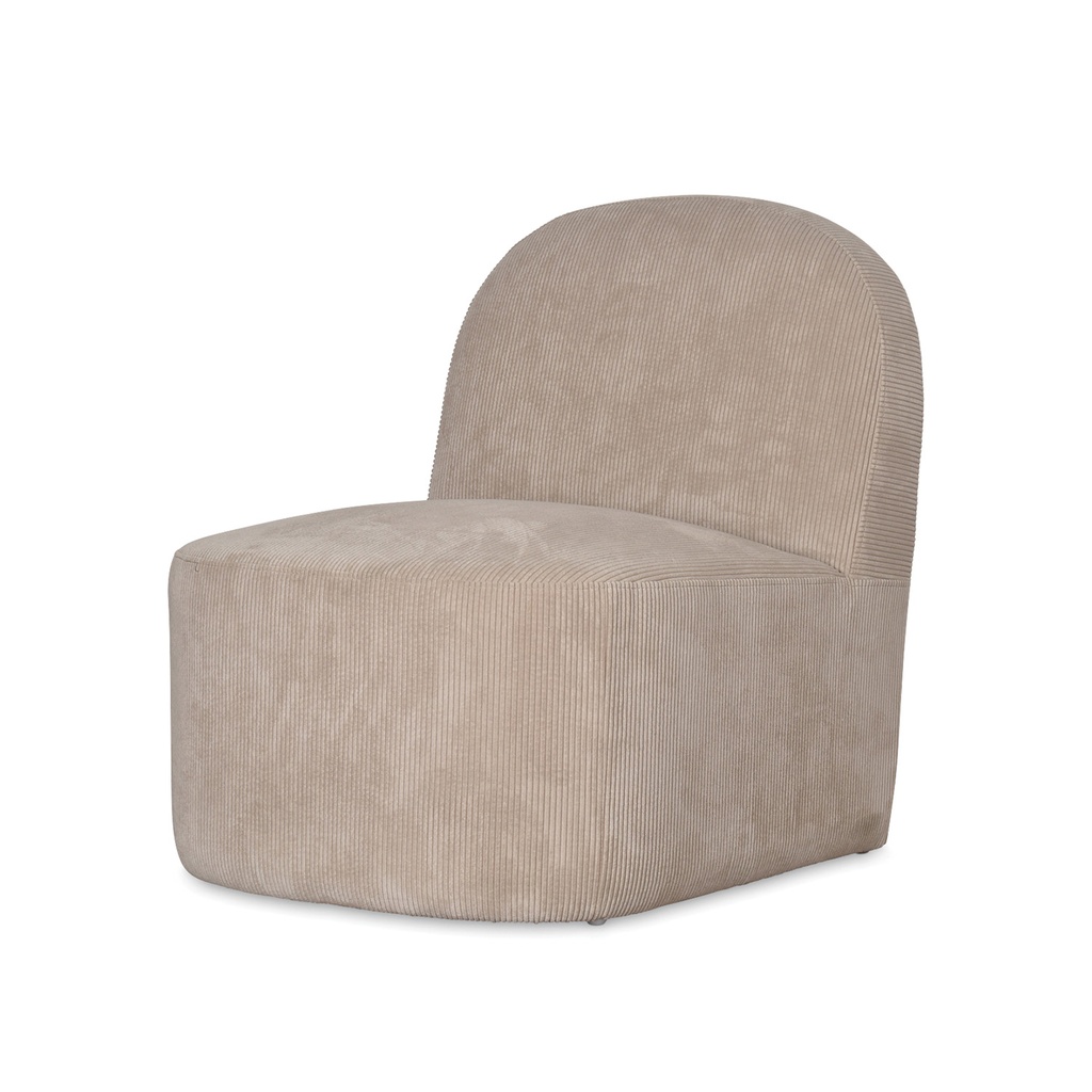 Fauteuil en velours côtelé beige, compact et aux formes organiques.