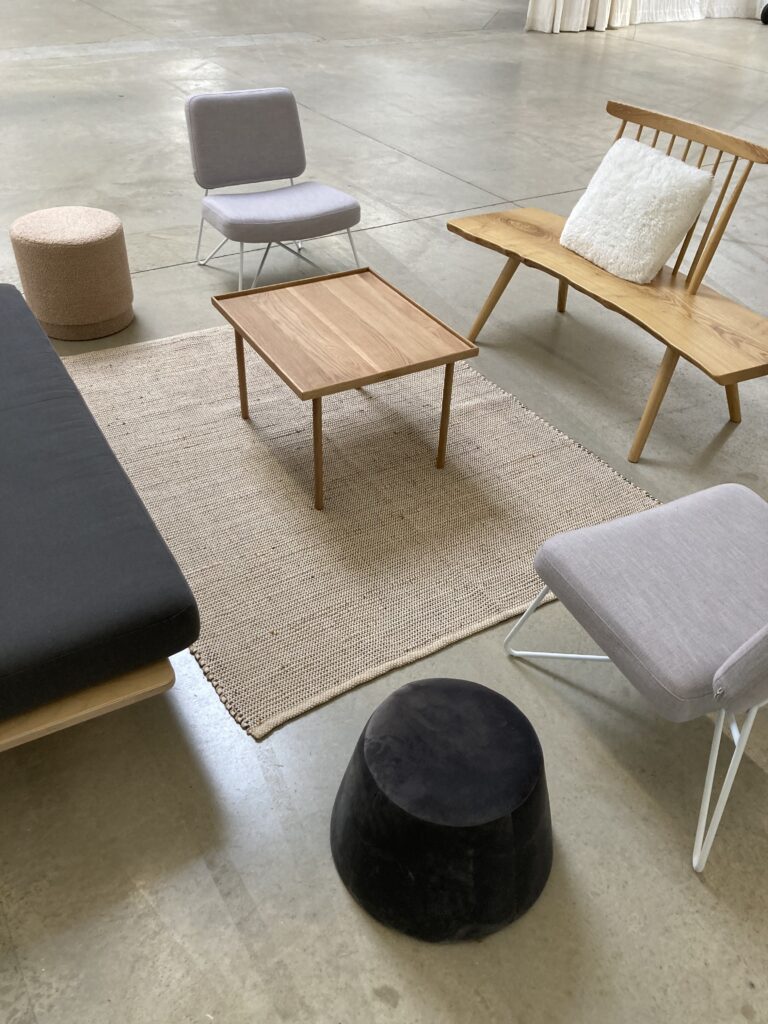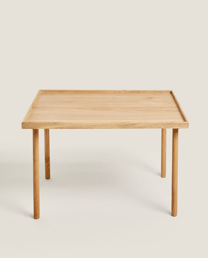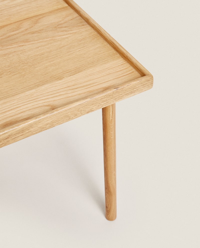 Jolie table basse en chêne clair. Design élégant avec son plateau à rebords et ses pieds fins.