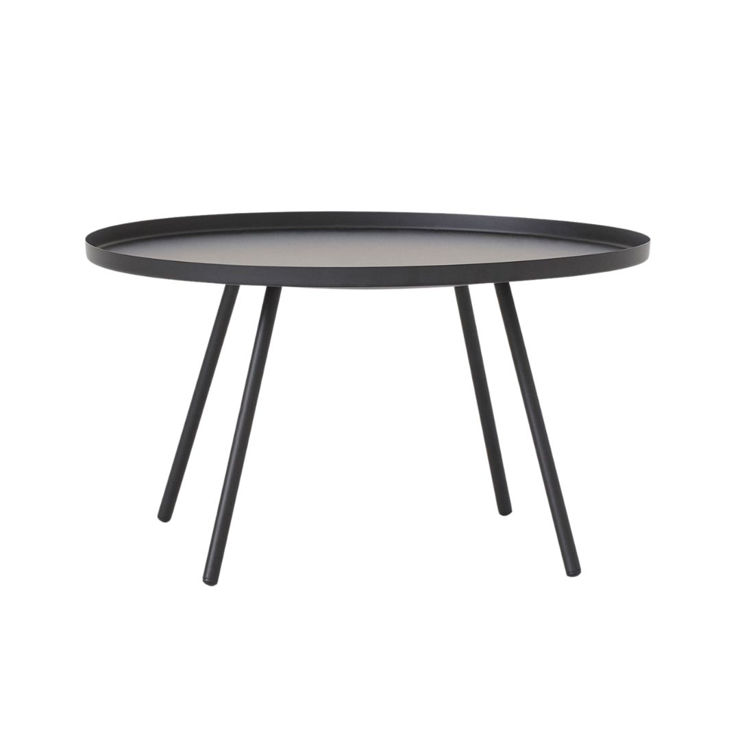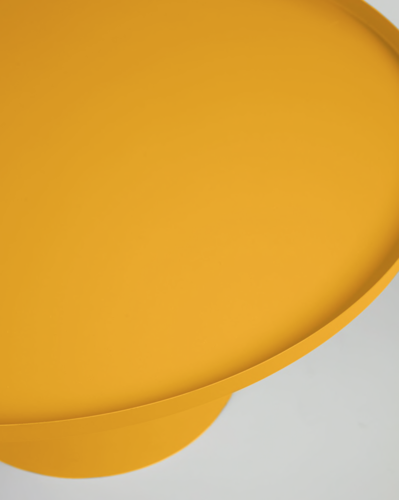 Table basse jaune moutarde en métal, au design rond et léger pour apporter une touche lumineuse à vos aménagements.