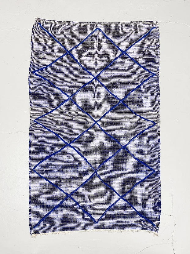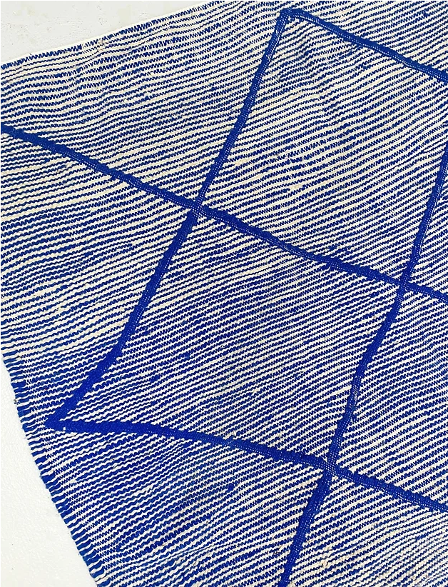 Tapis Kilim bleu Majorelle et écru. Très belle pièce artisanale qui saura s'intégrer à toutes les sélections.