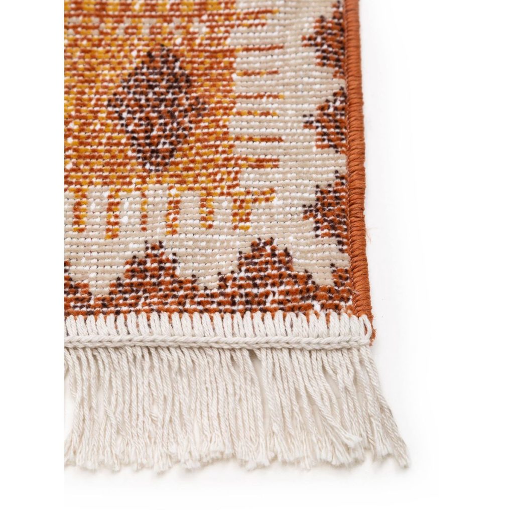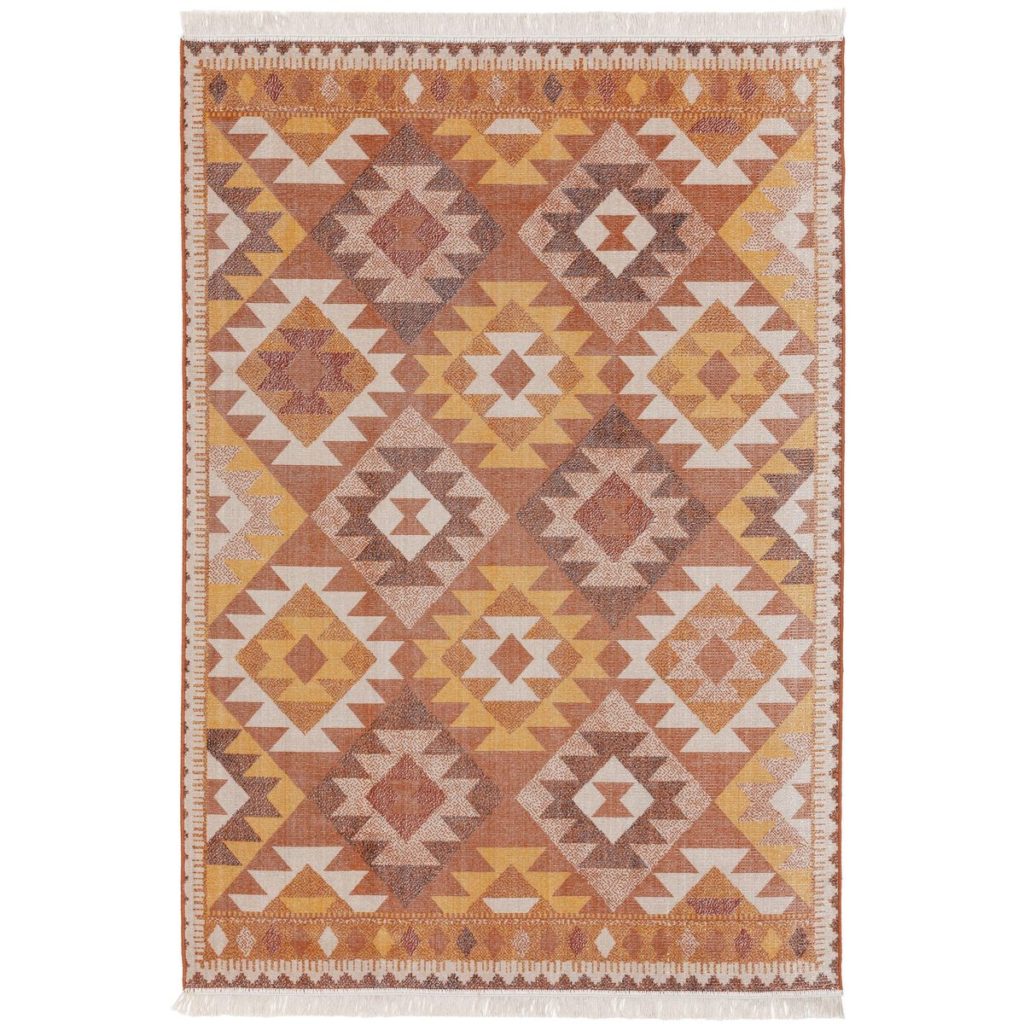 Joli tapis d'inspiration kilim, ses tons chauds et légèrement passés lui donne un charme très 70's.